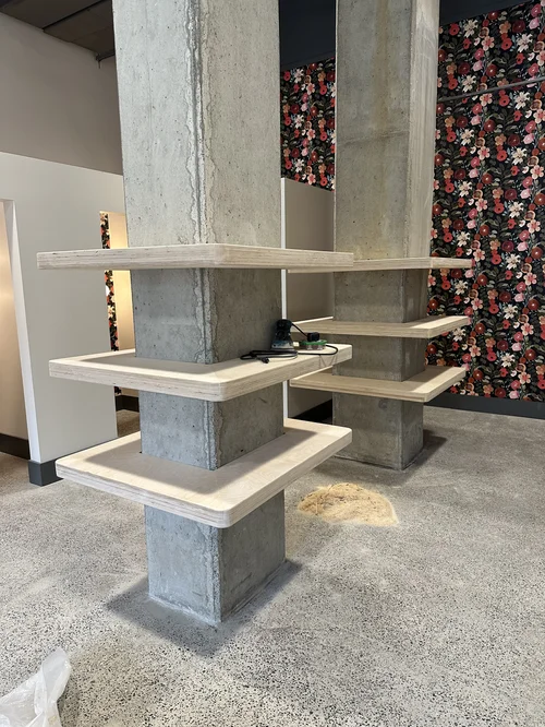My client needed to add quite a bit of functional display space to her clothing boutique located in a high-end shopping center. The shelves needed to add warmth and elegance to the overall design of the space, and, oh yeah… They had to be mounted on these gigantic concrete pillars (not so conveniently located) in the middle of the sales floor.